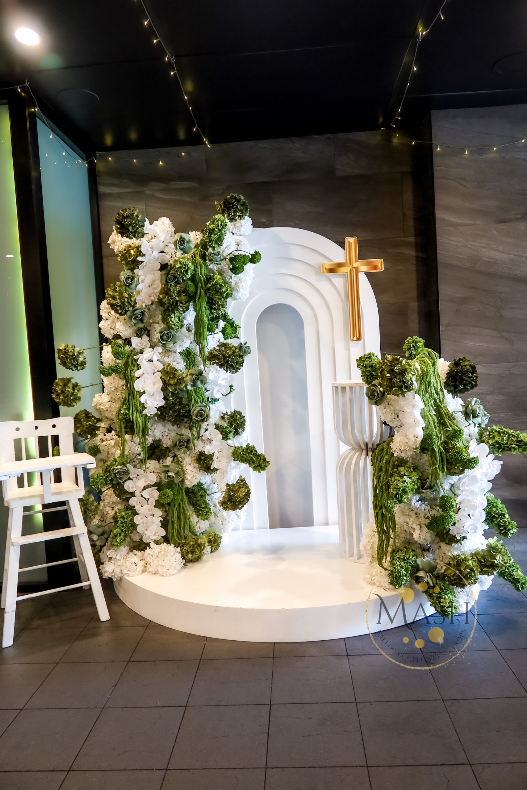 Celebrate your child’s Christening or Baptism with our elegant Package 1. This setup includes a custom white arch backdrop, lush florals in green and white, and luxury props for a refined look. The design creates a sacred atmosphere that complements the significance of the day. Additionally, pair it with our balloon garlands or table décor for a complete styling solution.