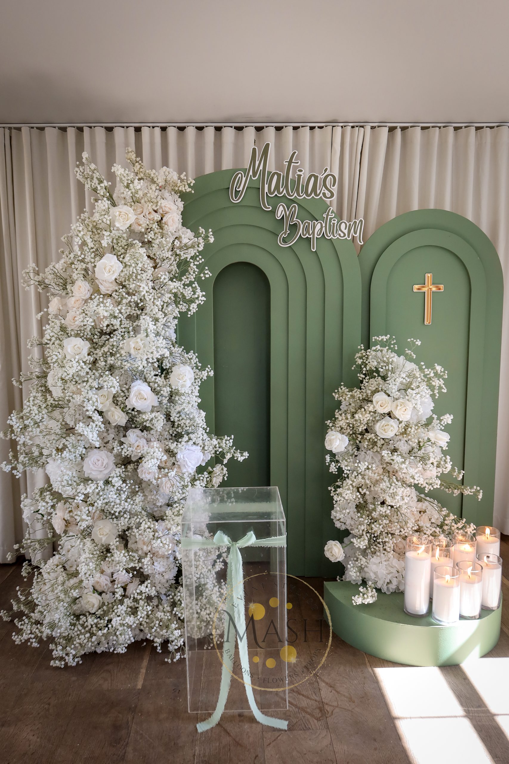 Celebrate your child’s Christening or Baptism with Package 2. This design features a sage green arched backdrop, luxury white florals, and a golden cross. The setup also includes candles for warmth and serenity. Furthermore, the modern design blends perfectly with the spiritual significance of the occasion. Pair it with our floral centerpieces or balloon garlands for a cohesive event design.